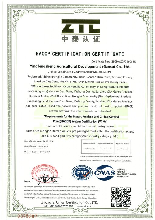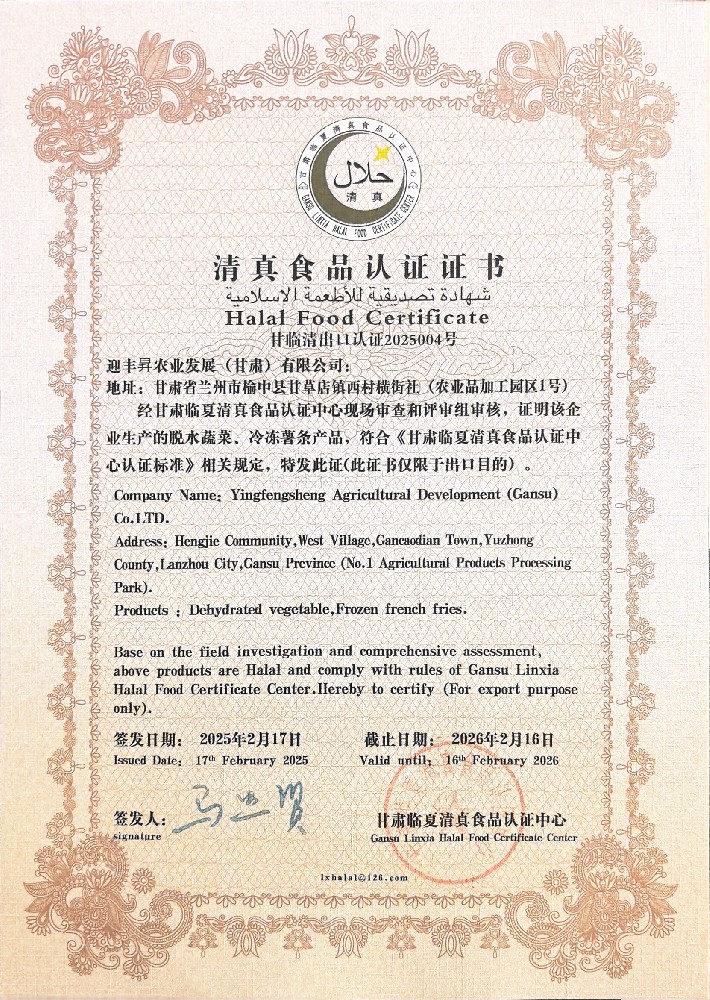 Yingfengsheng Agricultural Development (Gansu) Co., Ltd. is a national, group-type large-scale supply chain enterprise, its business covers potato planting, agricultural products purchase and sale, dehydrated vegetable processing, potato chips and other potato products processing, vegetable process...