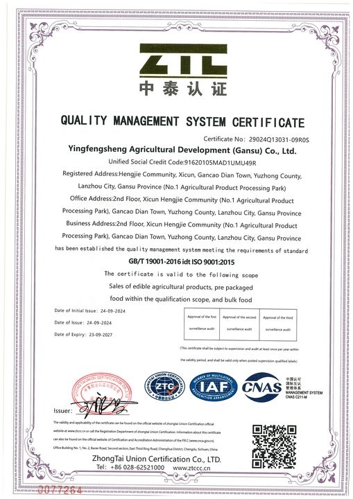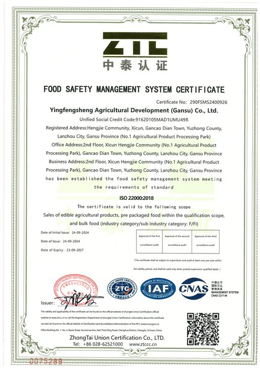 Yingfengsheng Agricultural Development (Gansu) Co., Ltd. is a national, group-type large-scale supply chain enterprise, its business covers potato planting, agricultural products purchase and sale, dehydrated vegetable processing, potato chips and other potato products processing, vegetable process...